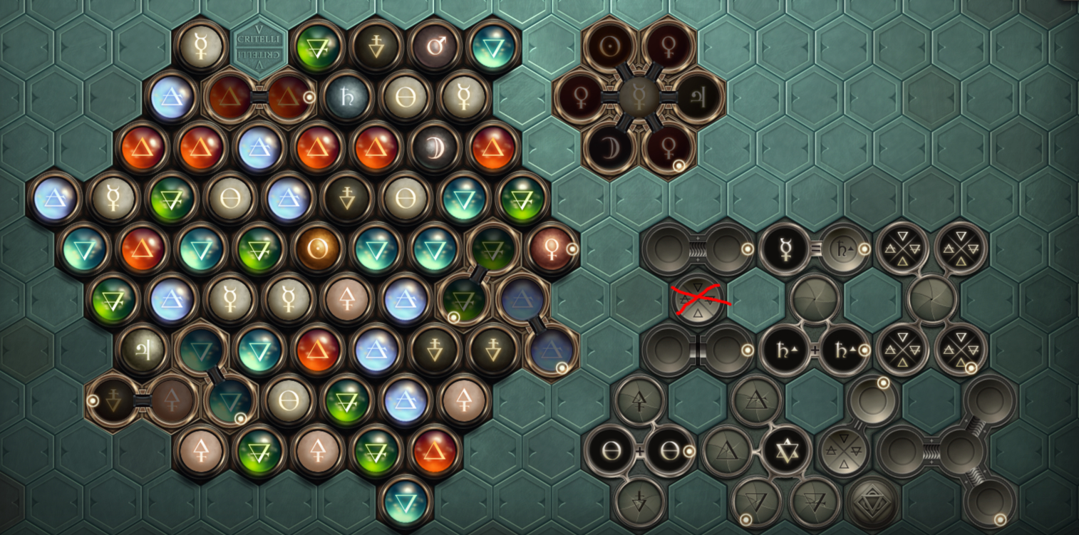 Your goal is to clear the board. Select a marble, then select a matching marble to remove them both from the board. The four cardinals match with others of the same type. Salt matches with any of the cardinal elements via duplication. Vitae and Mors will only match with their opposite. The metals match with quicksilver, but must be transmuted into a cool lesbian wheel instead because I say so.